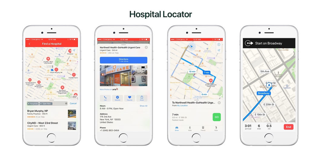 While moving apartments, your friend slams his finger in your car door and breaks it. Using the Emergency app, find a hospital and navigate your way there.
